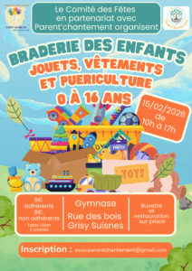 Venez chiner à la braderie des enfants organisée en partenariat entre le comité des fêtes et l’association de parents d’élèves Parent’chantement : vente de jouets, livres, puériculture d’occasion à destination des enfants de 0 à 16 ans.
