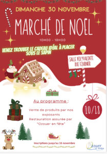 Rendez-vous le dimanche 30 novembre à la Salle Polyvalente (Rue Fournier) pour le Marché de Noël, de 10h à 18h. Vous y trouverez des idées cadeaux et pourrez vous restaurer sur place.