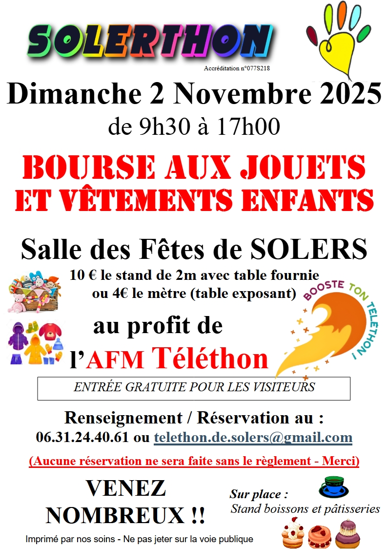 Dans le cadre du Téléthon, présent dans notre village depuis 25 ans, l’association Solerthon organise sa Bourse aux Jouets et vêtements enfants le dimanche 2 novembre à la Salle des Fêtes de Solers, Place de la Mairie.