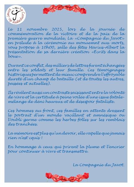 10h00 : Présentation de la dernière création de La Compagnie du Javot « Écrits dans la boue », à la salle des fêtes Marius-Albert.