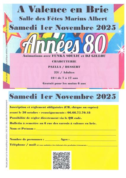 Soirée années 80′ organisée par le Comité des Fêtes le samedi 1er Novembre 2025, à la salle des Fêtes Marius-Albert ! Avec la participation du Groupe « Funka Soulic » en 1ère partie et « DJ Gilou » le restant de la soirée.